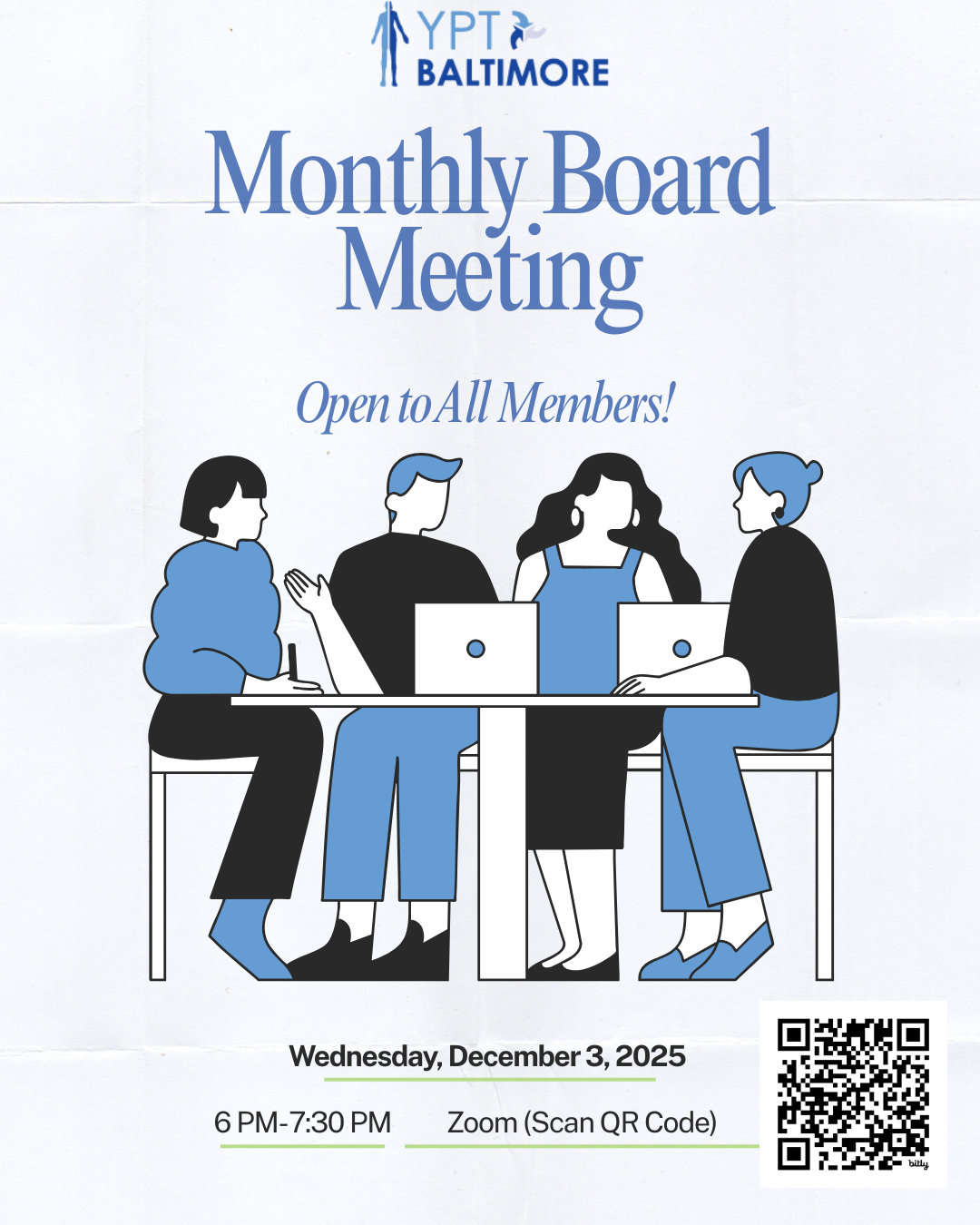 All YPT–Baltimore members are invited to attend our monthly board meetings, held on the first Wednesday of each month. Details for our December 3, 2025 meeting, scheduled from 6:00 PM to 7:30 PM, are provided below: