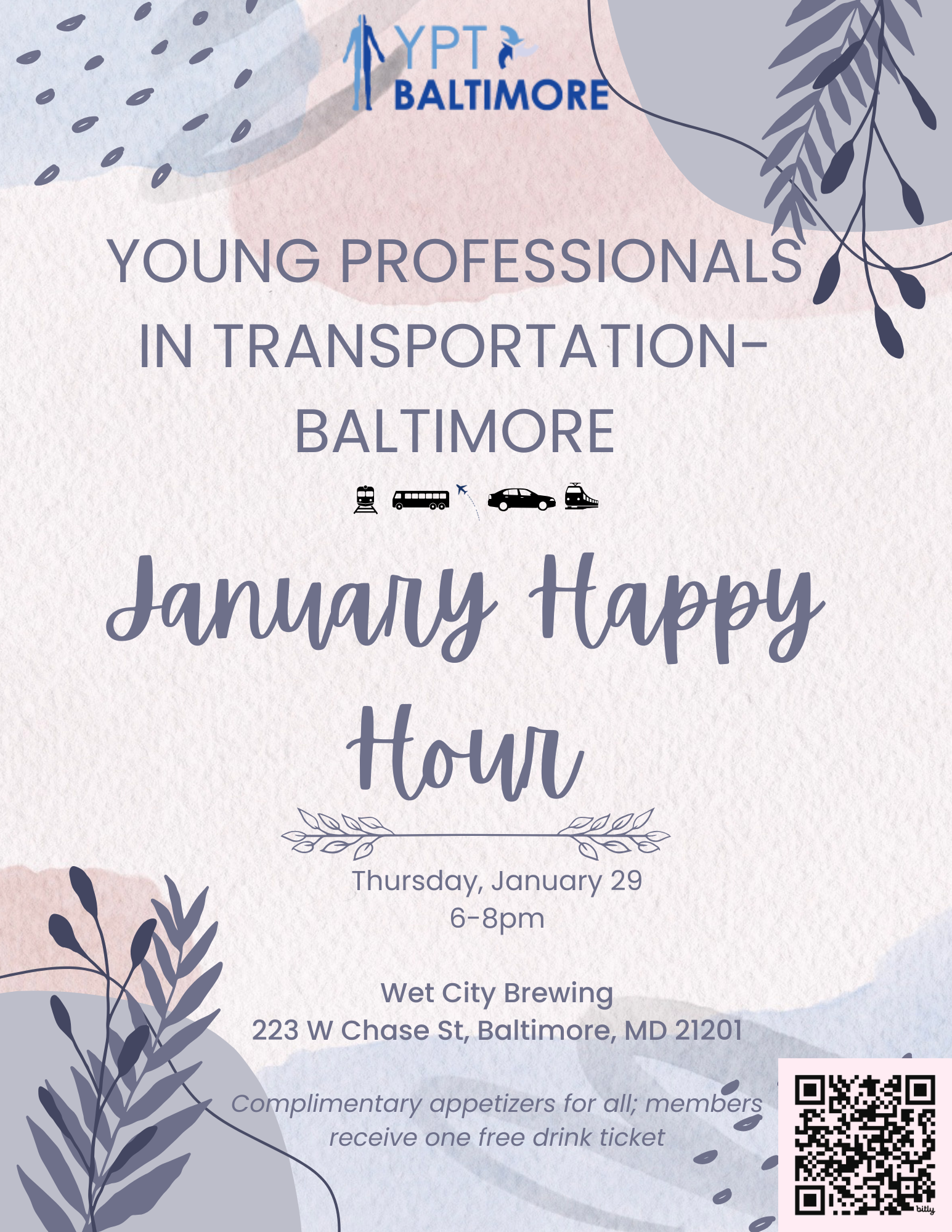 Join Young Professionals in Transportation–Baltimore for our first happy hour of 2026. Connect with transit, planning, engineering, policy, and mobility professionals in a relaxed, social setting, fewer acronyms, more conversation. Complimentary appetizers are available for all attendees, and YPT members receive one free drink.